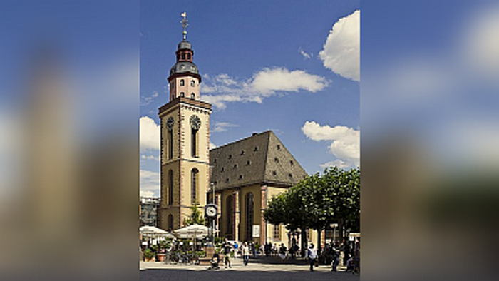 Der spätgotische Hallenbau mit Barockportalen aus dem Jahr 1681 gilt als Vorbild anderer Kirchenbauten. Schon die Familie Goethe ging in die St. Katharinenkirche zum Gottesdienst. 1944 wurde die Kirche zerstört und 1954 wieder aufgebaut. Besonders sehenswert sind die gotische „Maria mit der Mondsichel“, sowie eine spätgotische Katharinenfigur, die Emporenbilder aus dem 17. Jahrhundert und die Glasfenster von Charles Crodel.
