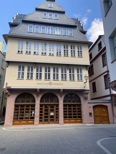 Das große Haus neben dem Frankfurter Kunstverein beherbergt den Gemeindesaal mit Küche im 1. Stock, im 2. Stock einem kleinen Sitzungsraum und derzeit noch das Gemeindebüro, welches aber zukünftig in das Nordend (Gethsemane) umziehen wird.