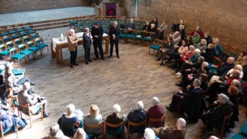 Am Sonntag trafen sich zahlreiche Mitglieder der vier Gemeinden in der Gethsemanekirche (Eckenheimer Landstraße 90), wo die neue Gemeinde ihren juristischen Sitz haben wird. Die Vorsitzenden der Kirchenvorstände erläuterten der Versammlung die Inhalte einer Fusionsvereinbarung, wie sie der Entwurf der gemeinsamen Steuerungsgruppe vorsieht. Dabei ging es um die Zusammenlegung von Finanzen und Verwaltung, das gemeinsame Verkündigungsteam (Pfarrer, Kirchenmusiker und Gemeindepädagogen), die Wahl des künftigen Kirchenvorstands und das, was die jeweiligen Kirchorte einbringen können.