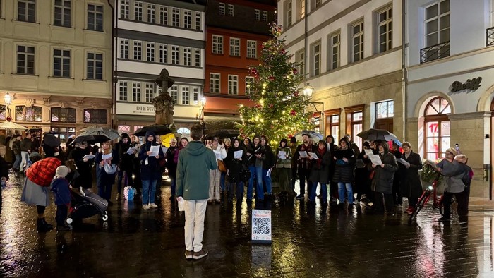 Mitten im geschäftigen Rummel der Weihnachtsmärkte haben Menschen aus den evangelischen Innenstadtgemeinden Anfang der Woche fröhliche "Lieder uff de Gass" gebracht: Vor dem schönen glitzernden Baum auf dem Hühnermarkt ging es los mit "Ding dong bells" und "Herbei, o ihr Gläub'gen". Nieselregen konnte den rund 40 gutgelaunten Sängerinnen und Sängern und Kantor Maximilian Bauer nichts anhaben. Schnell bildeten auch Zuhörer einen Halbkreis um den Chor, der Teil des "Lebendigen Adventskalenders" in der Neuen Altstadt war.